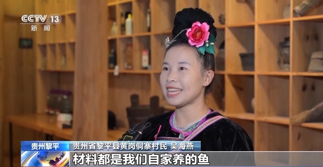 贵州省黎平县黄岗侗寨村民 吴海燕:材料都是我们自家养的鱼,现在生意的话还好,暑假还有寒假的时候,店子里面都满客。