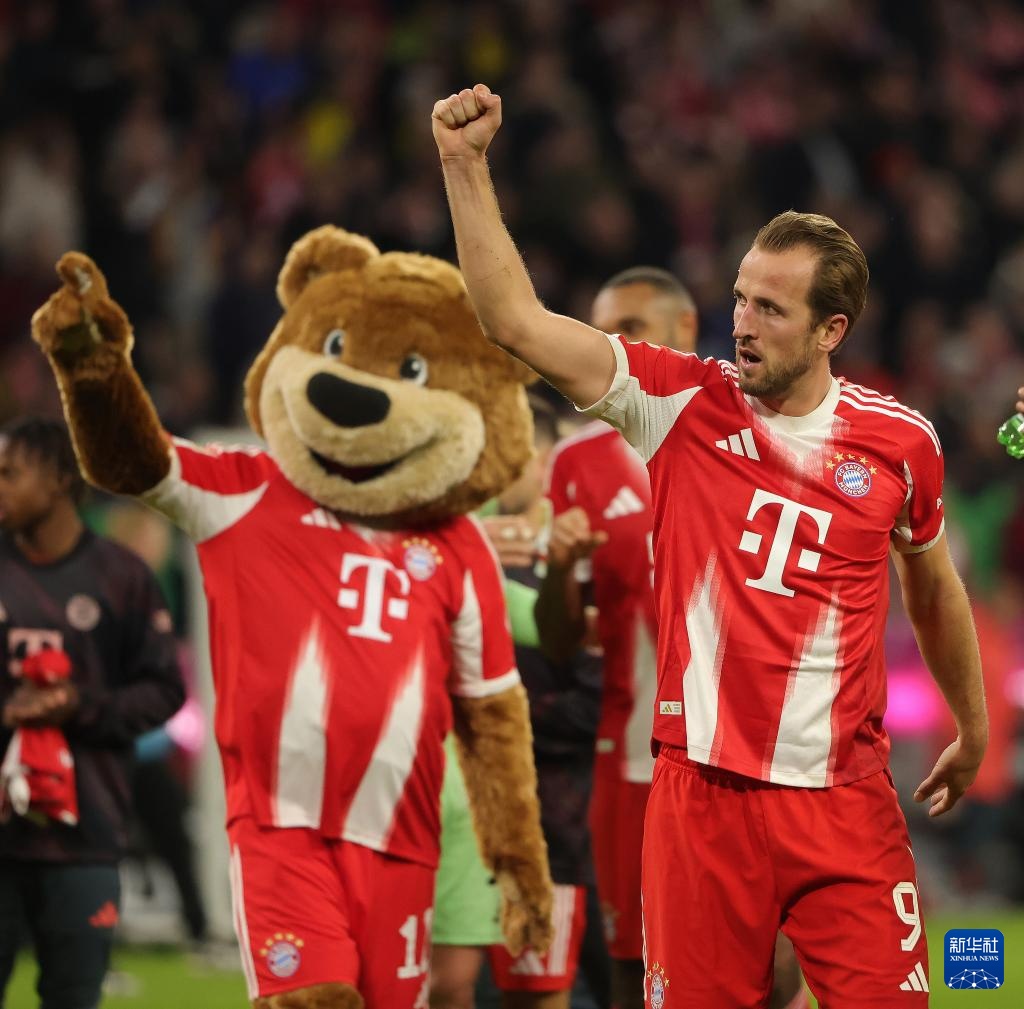10月18日,拜仁慕尼黑队球员凯恩(右)和拜仁吉祥物伯尼熊在比赛后庆祝。