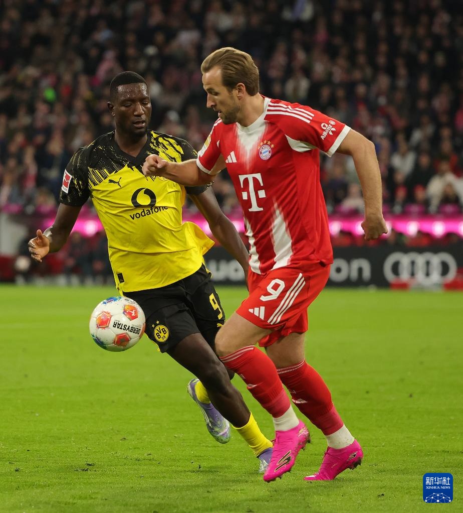 10月18日,拜仁慕尼黑队球员凯恩(右)和多特蒙德队球员吉拉西在比赛中拼抢。