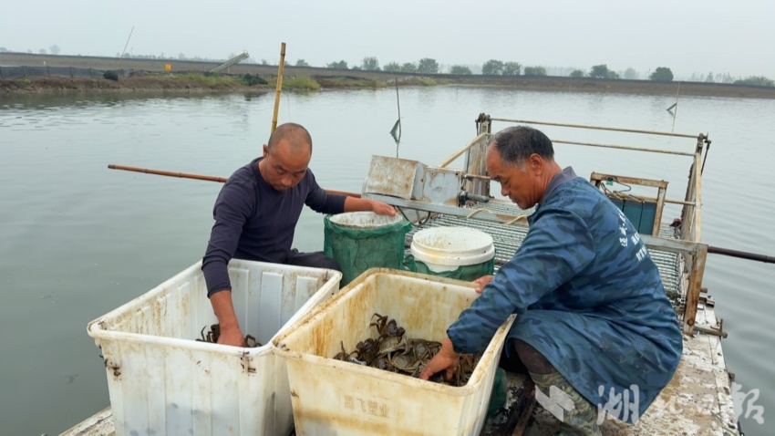 清晨,汉川市杨林沟镇十垸村的千亩河蟹生态养殖基地已是一派繁忙景象。工人们熟练地将一只只膘肥体壮、金爪黄毛的河蟹从水中捞起,随即送往河蟹出口打包场,按照规格、公母分拣打包。