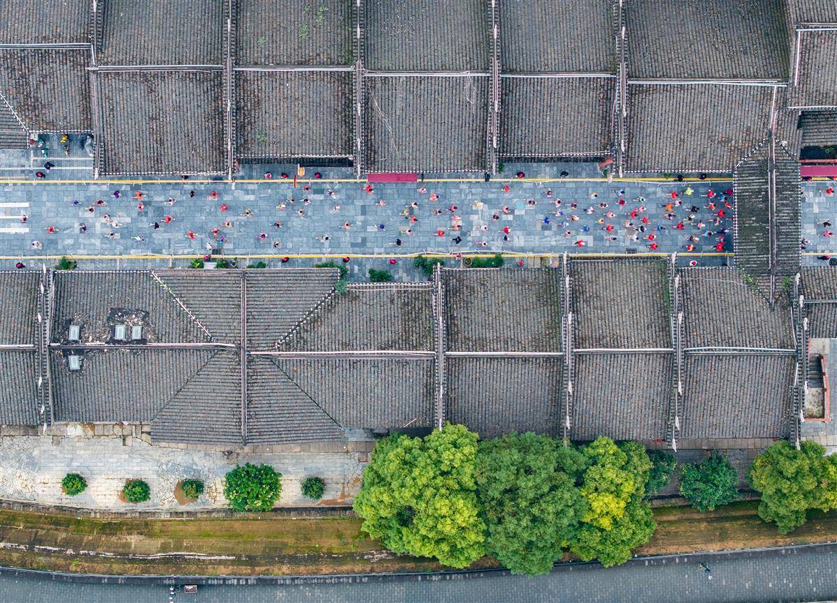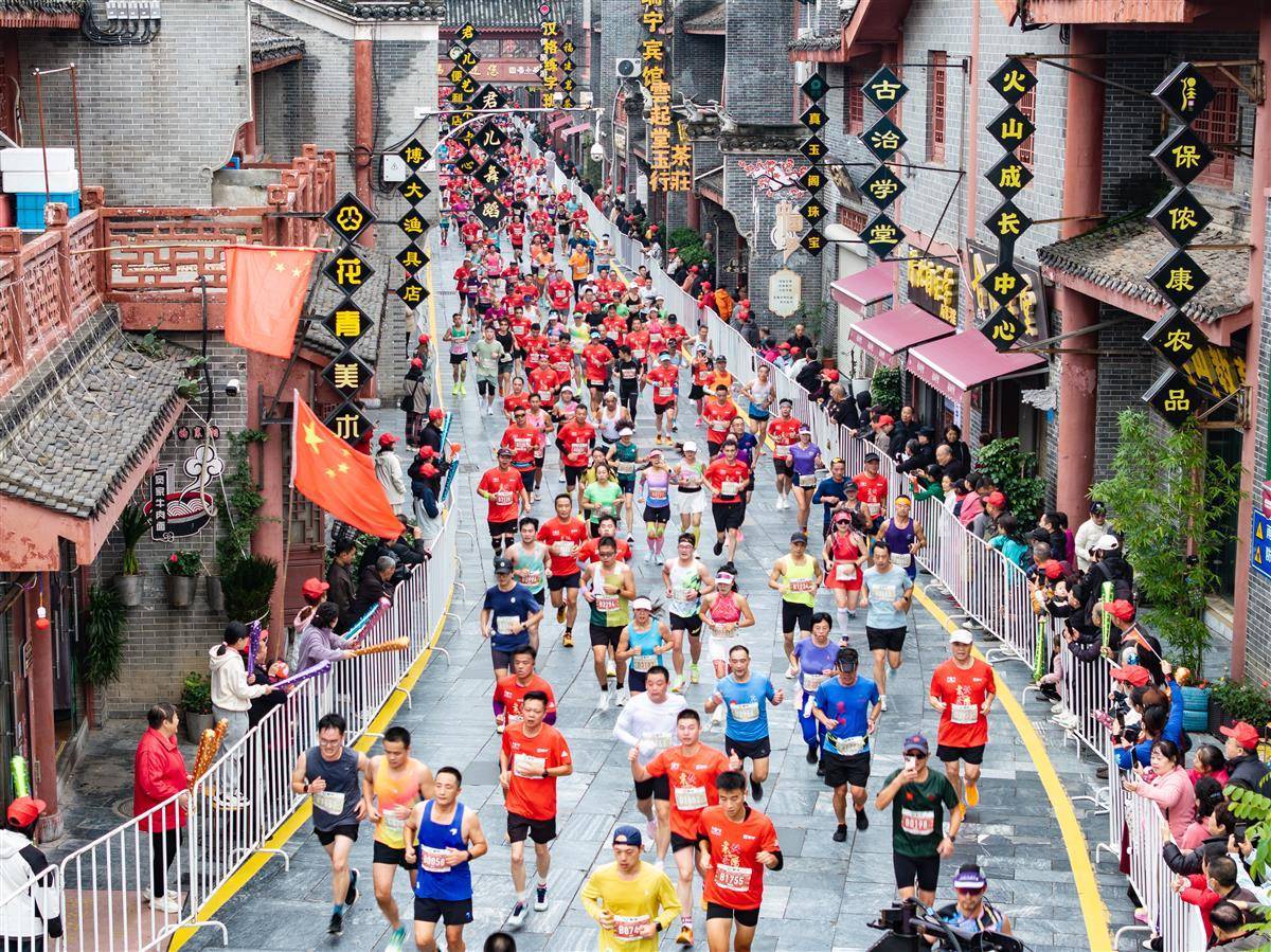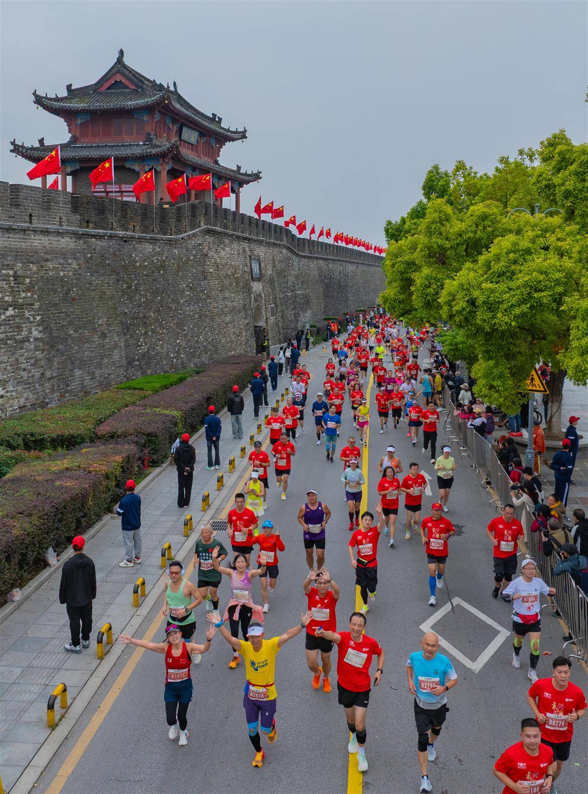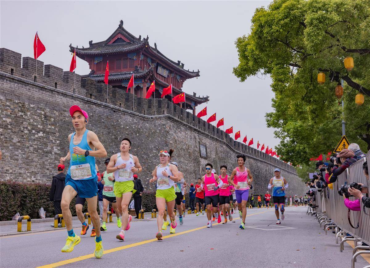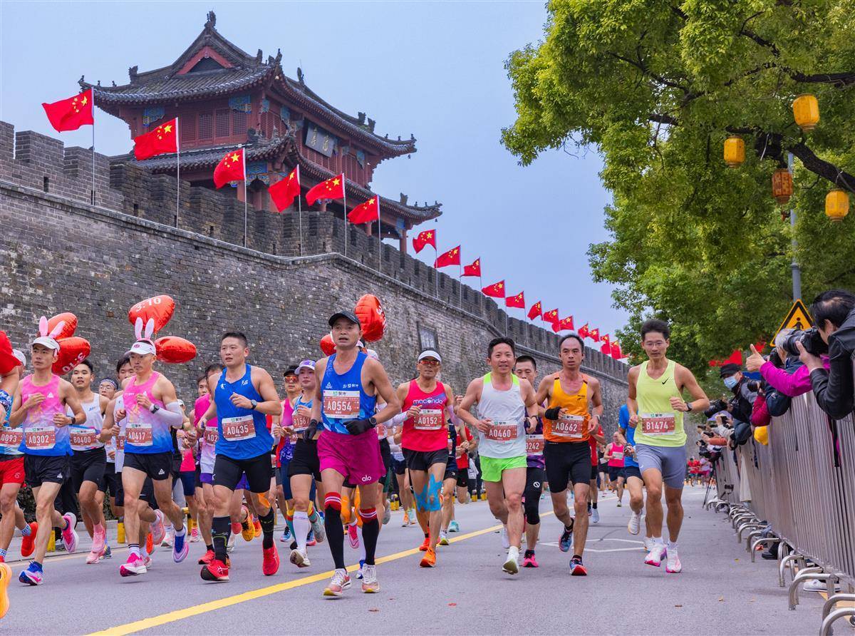 10月19日,襄阳马拉松选手们从襄阳古城里跑过。市民在赛道旁为选手们加油。(湖北日报全媒记者 柯皓 摄)