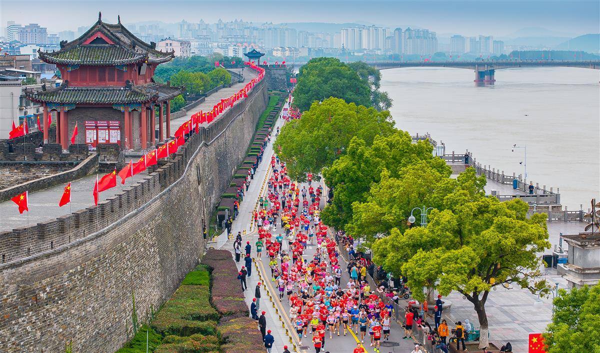 10月19日,襄阳马拉松选手们从襄阳古城临汉门前跑过。(湖北日报全媒记者 柯皓 摄)