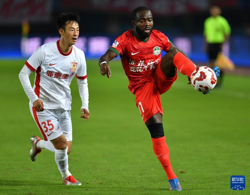 10月19日,长春亚泰队球员奥莫伊胡安弗(前左)与河南俱乐部酒祖杜康队球员钟义浩(前右)拼抢。