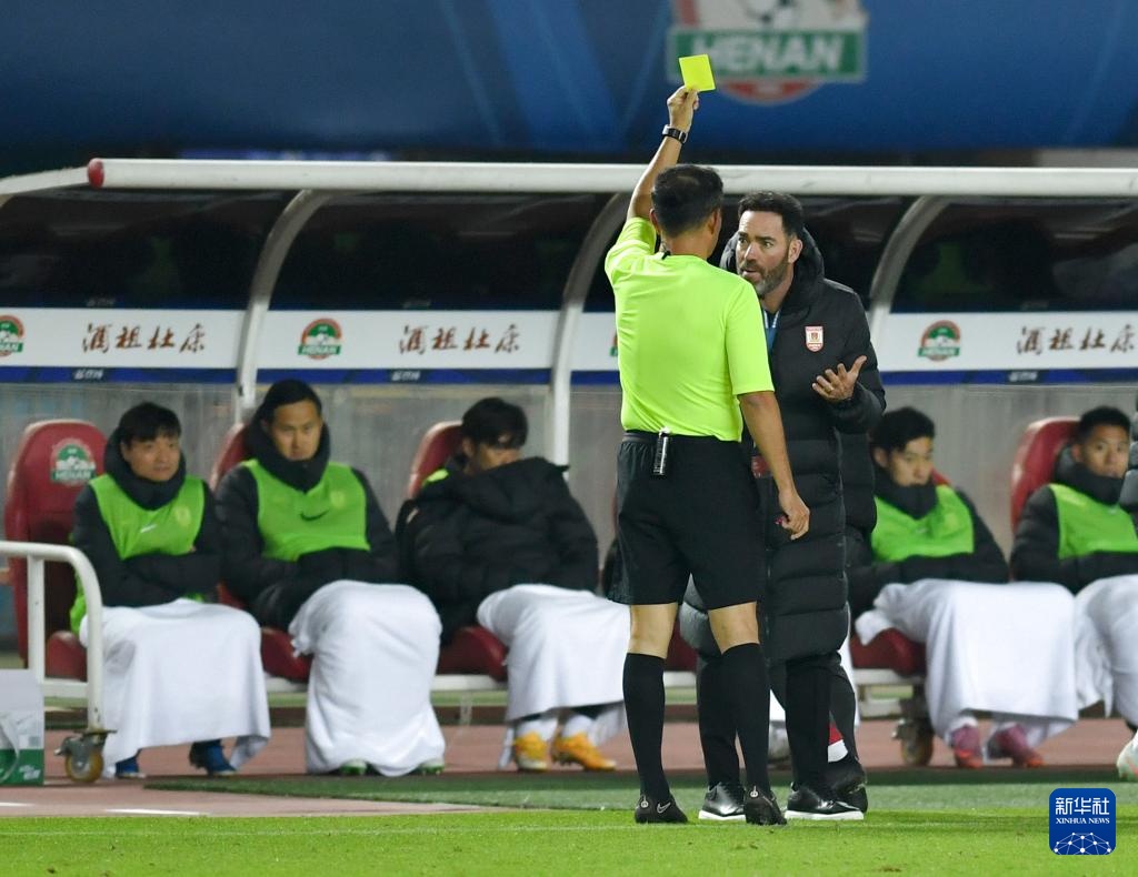 10月19日,主裁判刘威(前)向长春亚泰队主教练苏亚雷斯出示黄牌。