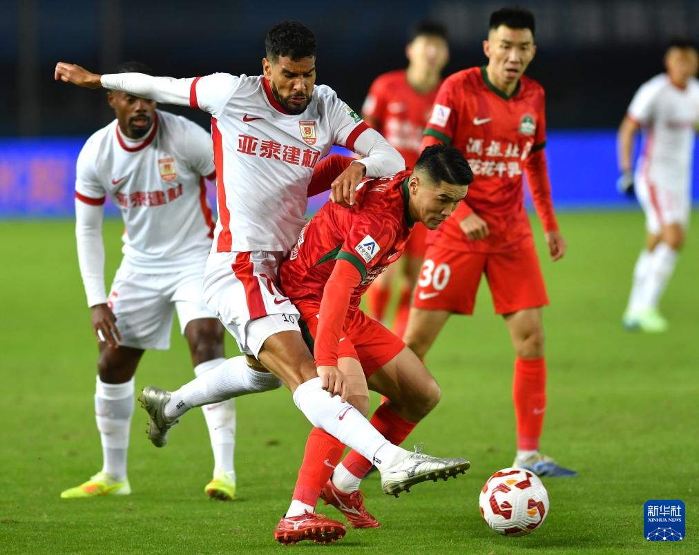 10月19日,长春亚泰队球员西普里安(左)与河南俱乐部酒祖杜康队球员纳萨里奥(中)拼抢。