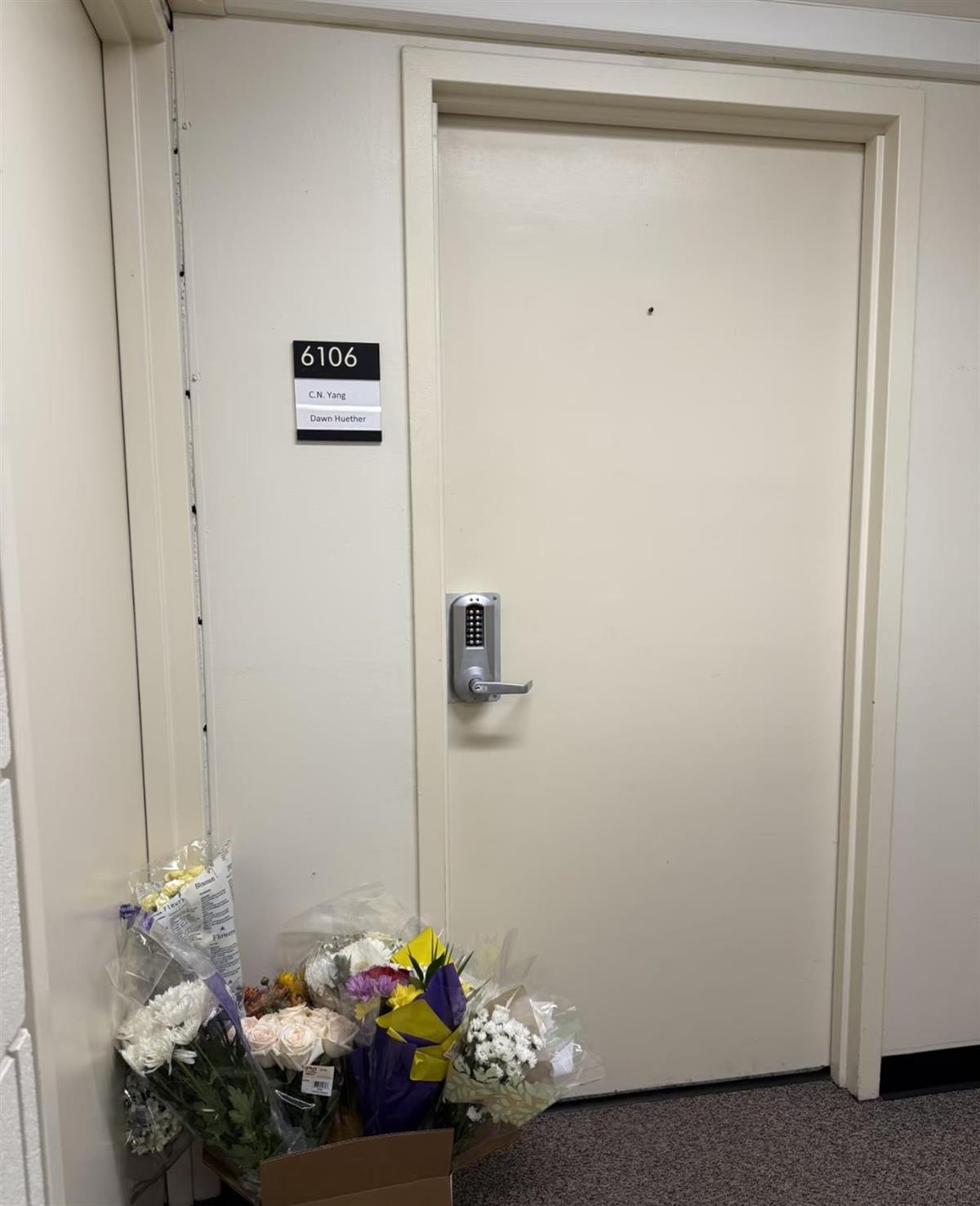 网友拍摄的杨振宁在美办公室前摆满鲜花