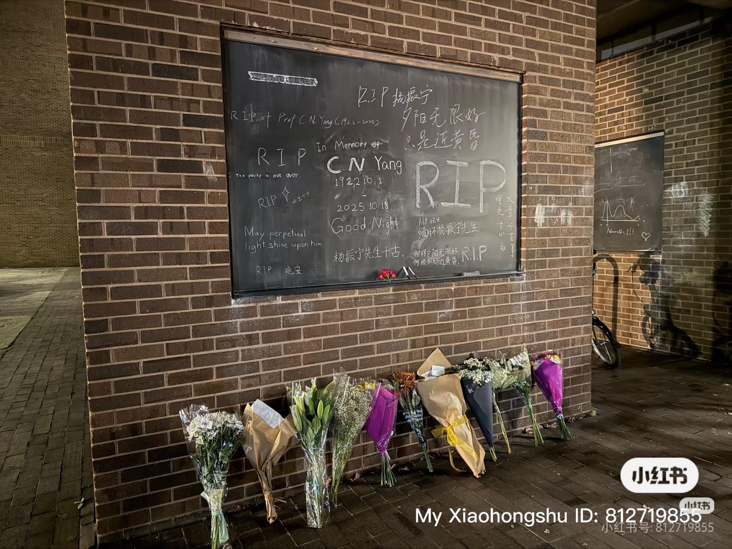 当地时间10月19日,一位在石溪分校留学的中国学生发文缅怀:石溪不会忘记您,杨振宁先生。配图显示,在印有杨振宁名字的办公室门口,已经摆满了鲜花,学校一处黑板上则写满了留言:RIP C N Yang。