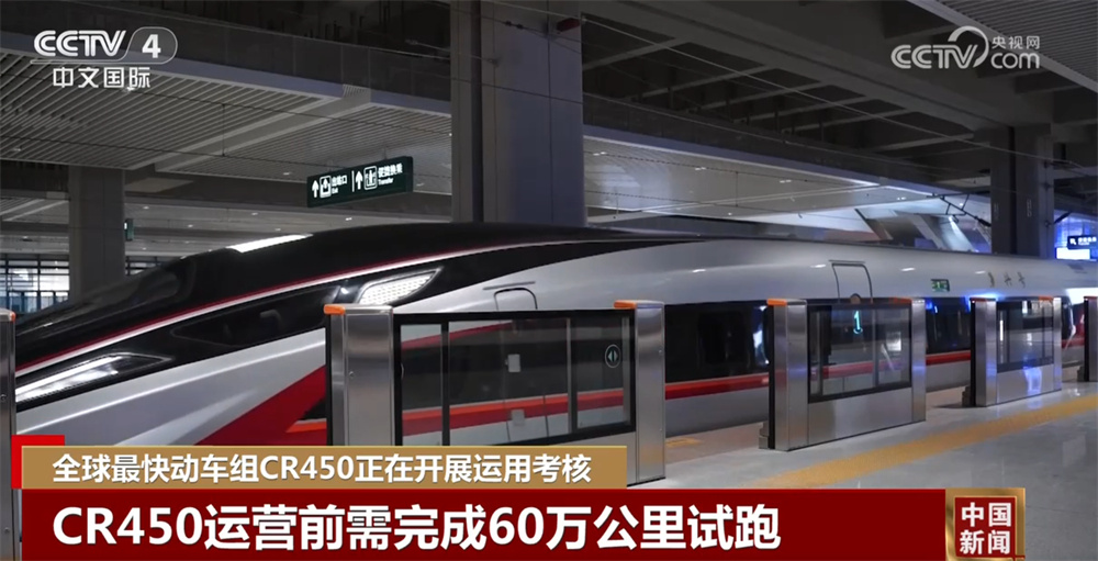 央视网消息:被称作“全球最快高铁”的CR450动车组样车去年底公布后,目前正在不同速度、不同场景中进行多项试验。试验期间,CR450动车组跑出了动车组单列时速453公里、相对交会时速896公里的最新纪录。目前,CR450动车组正在沪渝蓉高铁开展运用考核。来看总台央视记者20日在宜昌北站试验现场发回的报道。
