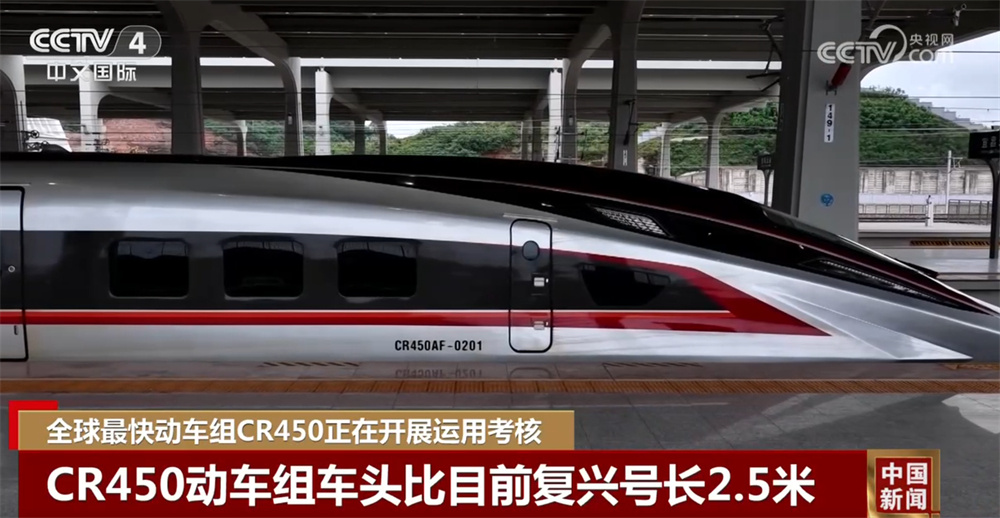 记者在现场看到,CR450动车组正在从宜昌北站发车,列车正在驶离站台,现在的速度看上去并不快,但是记者告诉大家一组数字:从起步到提速至时速350公里,它只需要4分40秒,而此前正在运行的时速350公里复兴号动车组则是需要6分20秒,这个提速的周期缩短了100秒。
