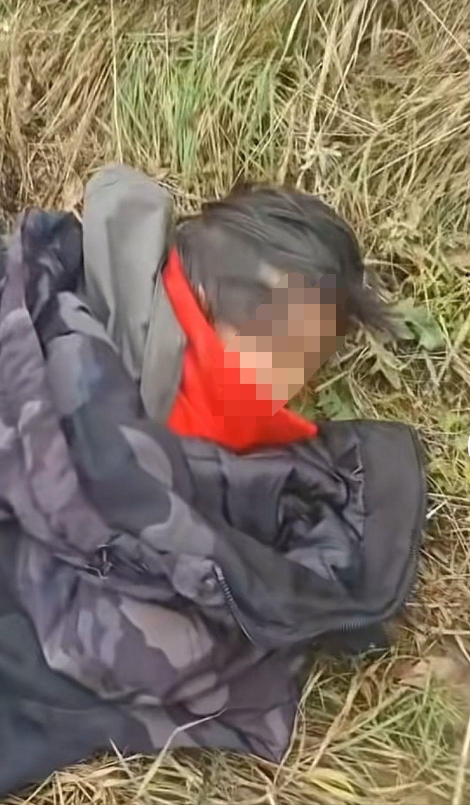 现场视频显示,身着红色棉袄的丁一趴在山沟的草窝处,身体因低温有些发抖,面部有轻微擦痕,她光着双脚,一只鞋散落在旁边。见此情形,王海军和张庆涛将自己身上的衣服脱下来给孩子盖上。