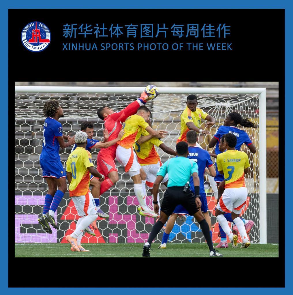 10月18日,哥伦比亚队门将加西亚(左四)在比赛中扑救。当日,在智利圣地亚哥进行的2025国际足联U20男足世界杯三四名决赛中,哥伦比亚队1比0战胜法国队,获得季军。