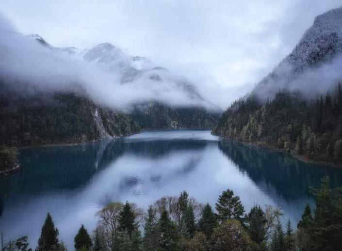 10月19日至10月20日,四川九寨沟迎来今年入秋以来首场降雪,部分地方树林银装素裹,雪花飘入湛蓝色的海子,碧水、彩林与白雪相映,半冬半秋,美不胜收。