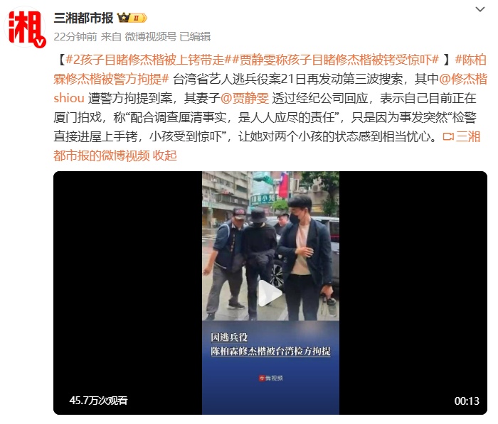 21日,台湾省艺人逃兵役案再发动第三波搜索,其中修杰楷遭警方拘提到案,其妻子贾静雯透过经纪公司回应,表示自己目前正在厦门拍戏,称“配合调查厘清事实,是人人应尽的责任”,只是因为事发突然“检警直接进屋上手铐,小孩受到惊吓”,让她对两个小孩的状态感到相当忧心。
