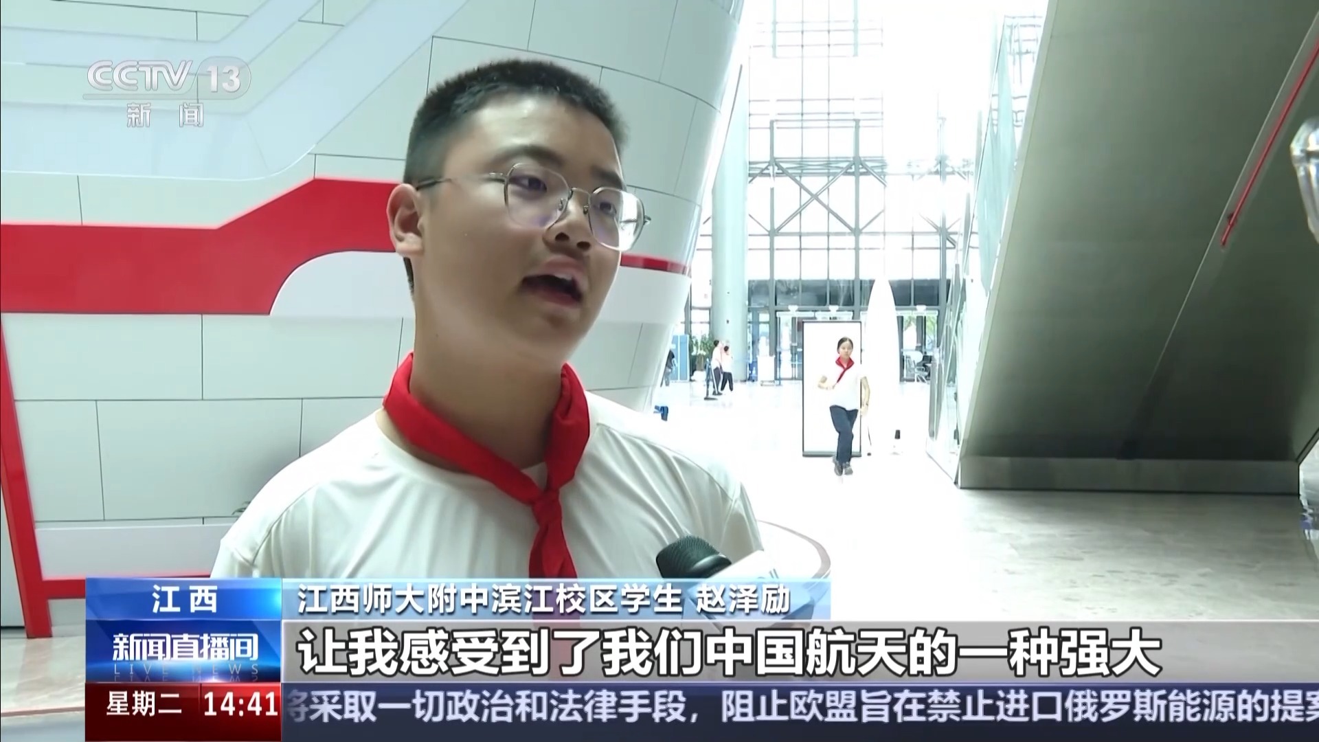 江西师大附中滨江校区学生 赵泽励:让我感受到了我们中国航天的一种强大,因为能把这么多航天员送上去,并且能在上面待6个月,其实是一种非常不容易的事情。