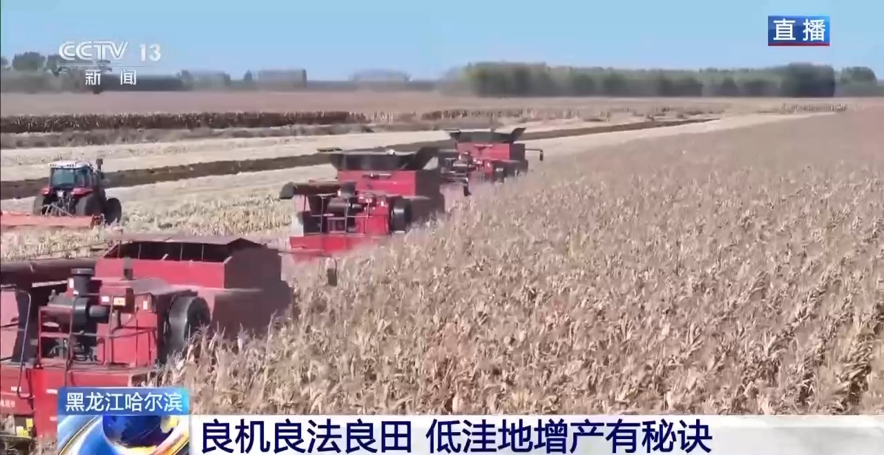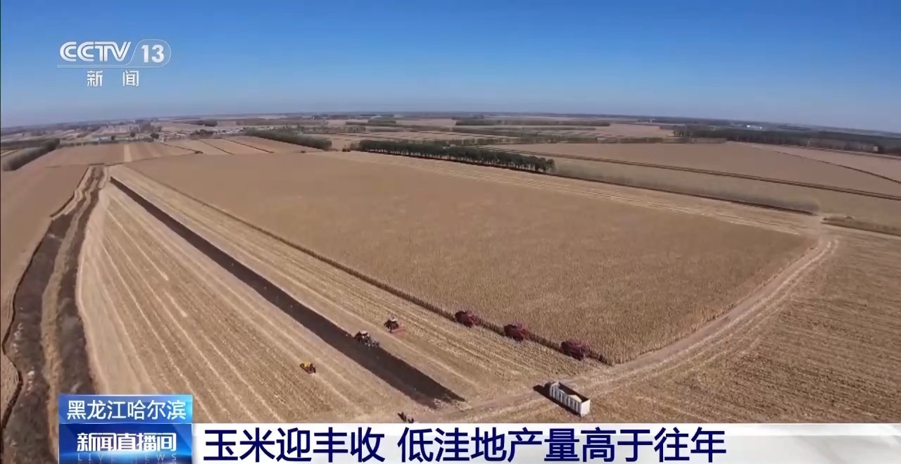 在哈尔滨市双城区西官镇创勤村,一片2000亩的玉米地有3台大型联合收割机正在作业,还有灭茬机车和翻地机车对刚收获完的地块进行作业。据农技人员介绍,今年气候条件适宜、降水适中,玉米普遍迎来了丰收。以当地一处偏低洼的地块为例,由于地势偏低、易涝,过去玉米平均亩产在1450斤左右。但是,今年情况有所不同,地势低洼的玉米长势也非常好,目前玉米的含水量在30%左右,亩产预计能达到1800斤左右,比过去高出300多斤。