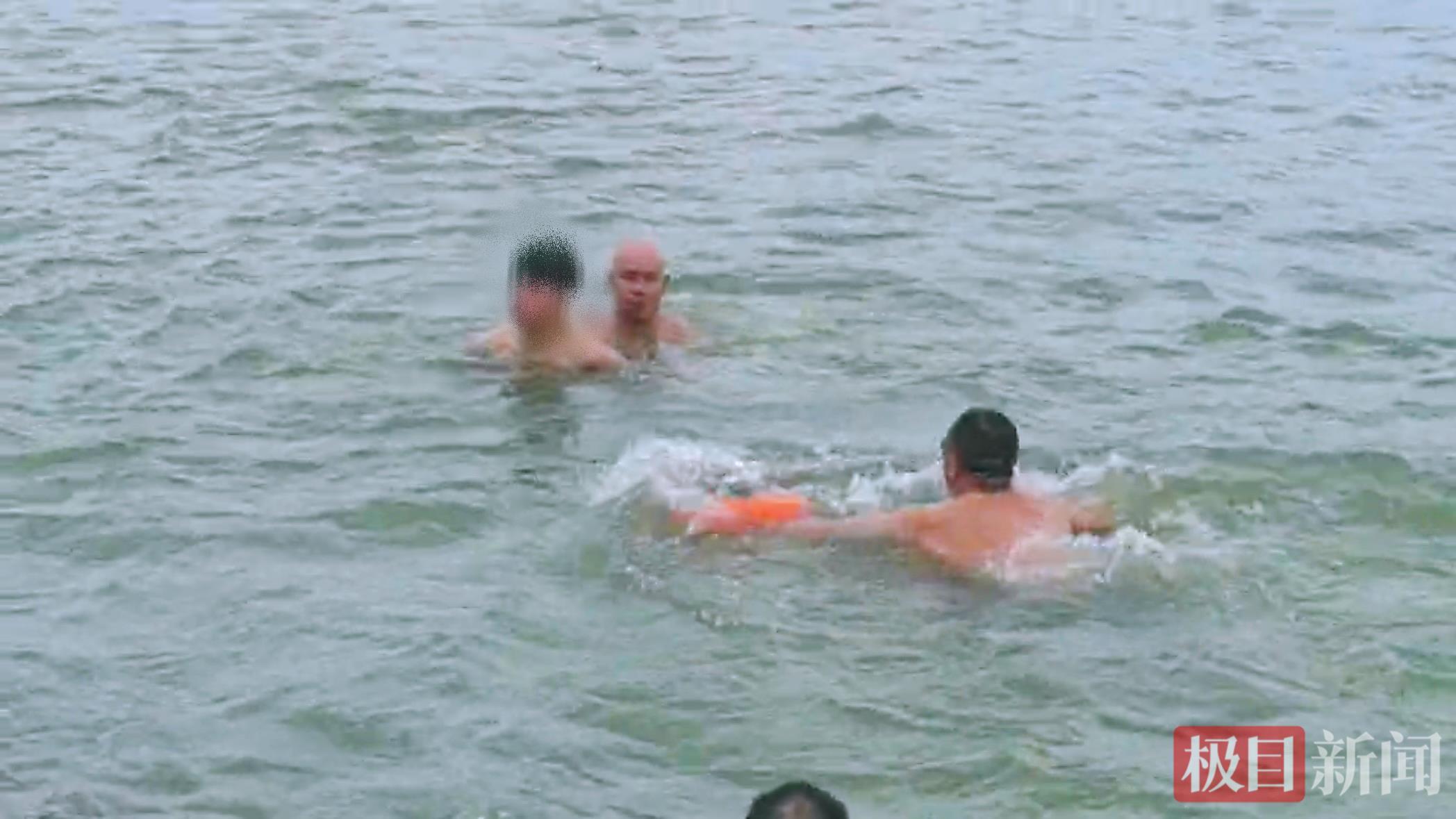 一直留意着动静的冬泳队员何柏林连忙纵身跃进江里游过去,从后方接近男生。舒仁庆也迅速增援过去,将浮漂递给遇险男生。凭借过硬的水上救援技术和强大的心理素质,两人默契配合。他们一边大声安抚,稳定男生情绪,一边采取专业的拖带方式,最终成功将其营救回岸边。