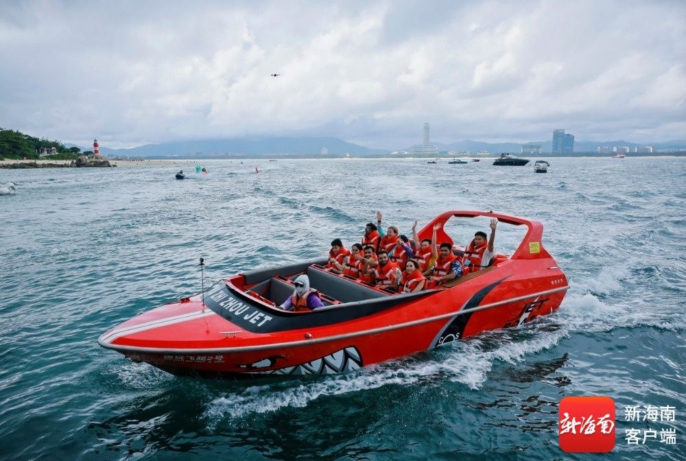 海南旅游国际推荐官乘坐“动感飞艇”,感受水上运动的激情与活力。记者 李昊 摄