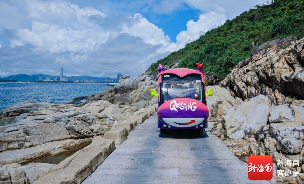 海南旅游国际推荐官搭乘环岛观光车游览蜈支洲岛。记者 李昊 摄