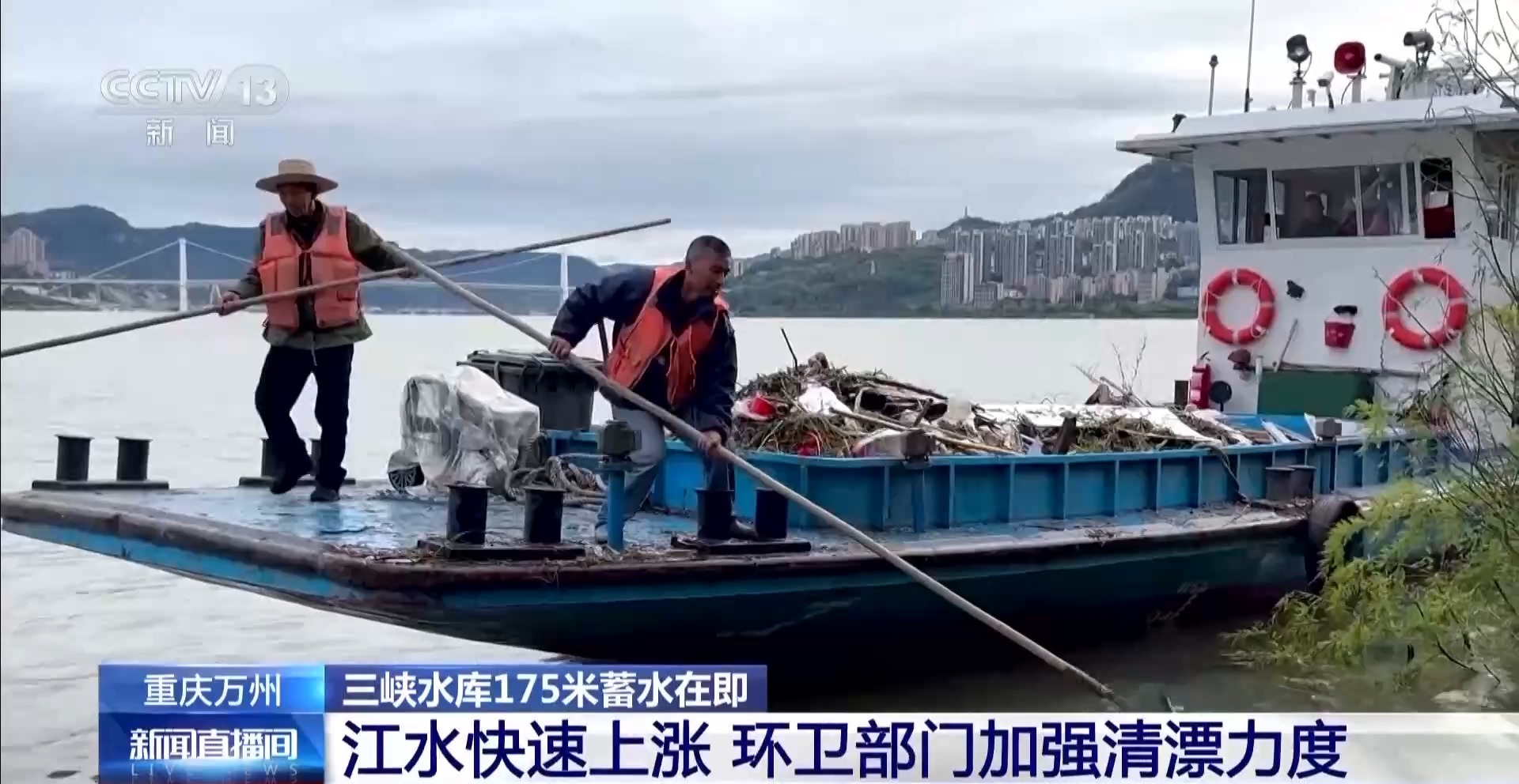 随着江水快速上涨,江边的树枝、杂物、垃圾等漂浮物也明显增多。为维护库区水环境与江面整洁,万州城区环卫部门全面加强清漂作业力度,每天派出数十艘机械与人工清漂船,在重点水域打捞清理,每艘清漂船日均打捞漂浮物量达6至7吨左右。