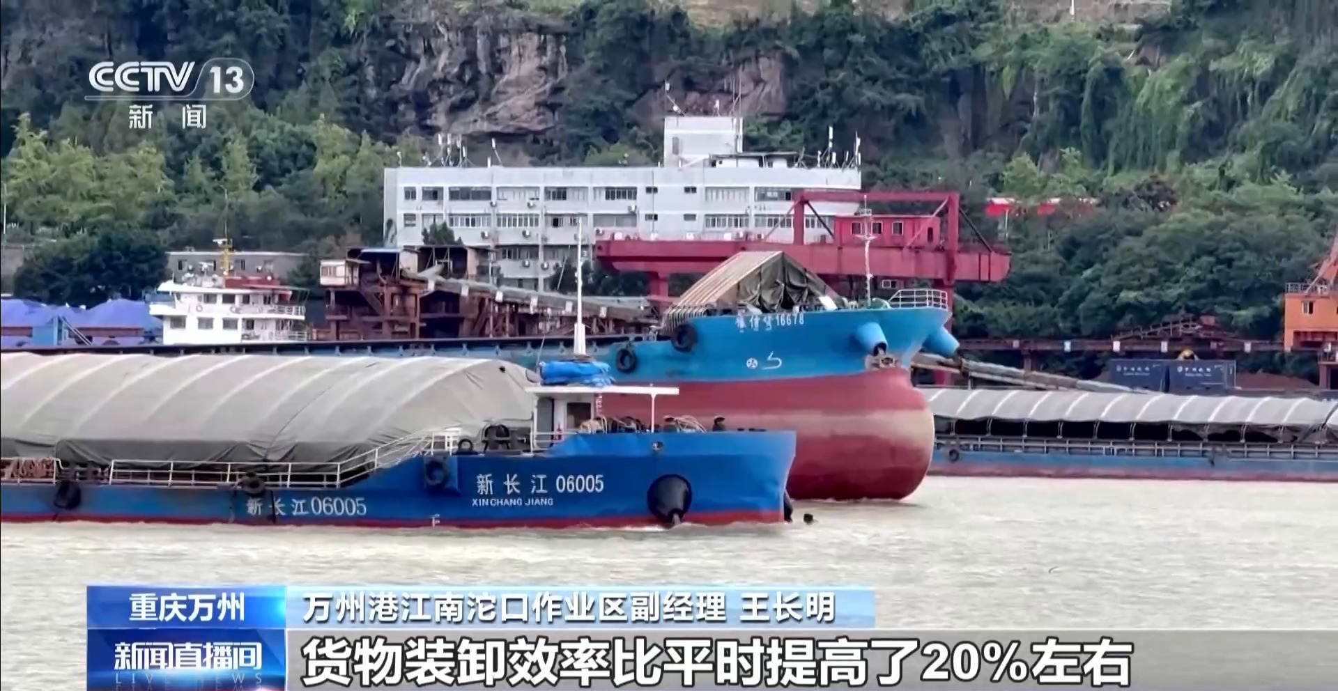 万州港江南沱口作业区副经理 王长明:现在水深增加了一二十米,万州港成了深水良港,货物装卸效率比平时提高了20%左右。