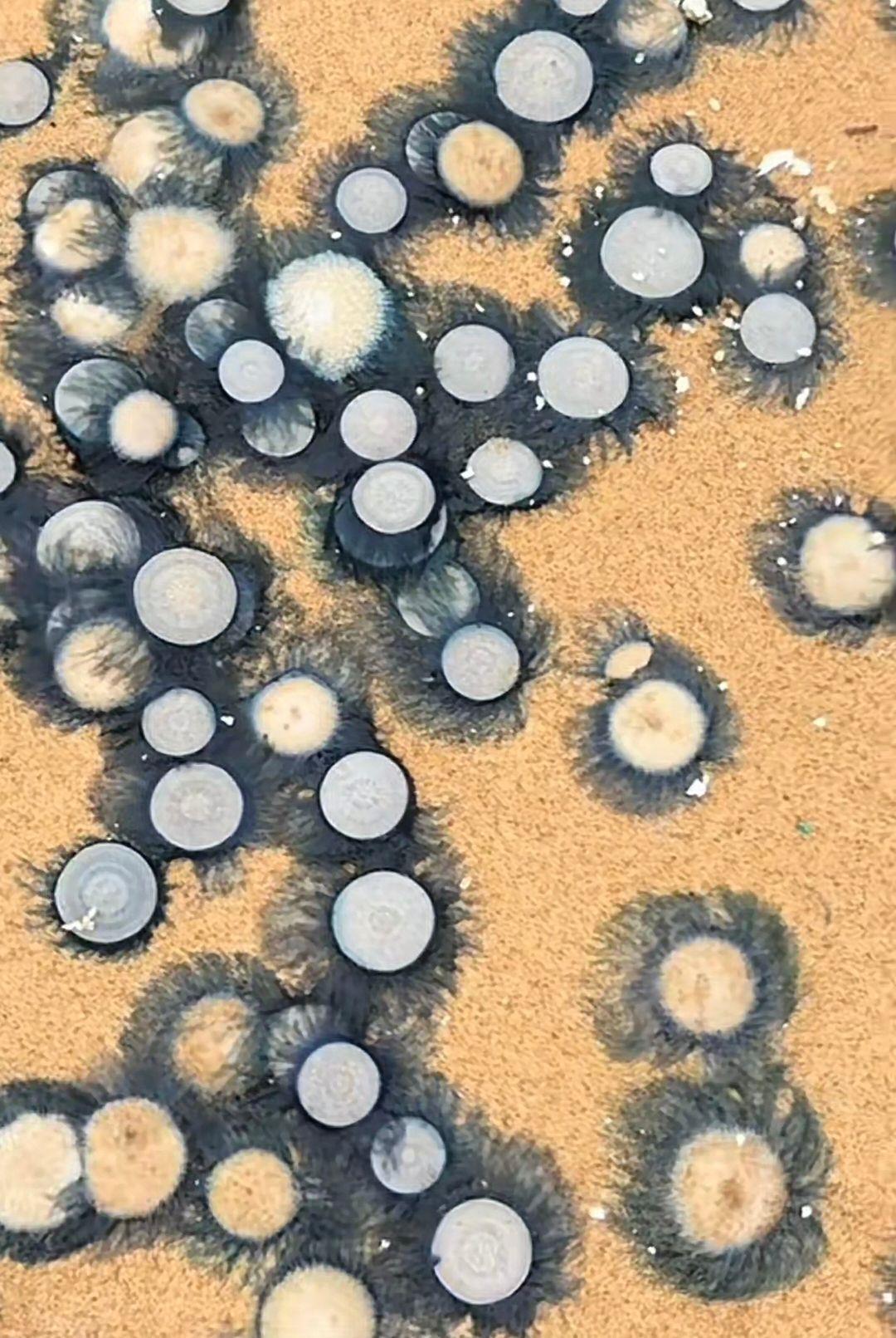 马军还解释了银币水母的特殊结构与移动方式:“它和普通水母不同,属于群体生物,由数百个水螅虫共同组成一个整体,看似完整,实则一碰就碎。这些水螅虫没有自主游泳能力,大多时候只能随着风浪、洋流漂移,仅具备简单的下潜能力。遇到外界刺激,它们会释放毒素自我保护,且这种毒素在水母死亡后仍会留存。建议公众远离分布区域,等待环卫部门清理或海浪将其带走。”