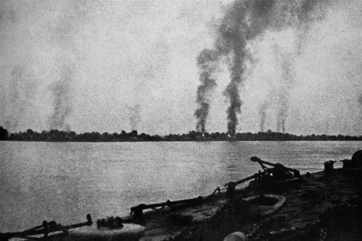 1938年10月,侵华日军随军记者从武昌江边拍摄被火焚烧的汉口城区。【图片由湖北日报全媒记者何宇欣扫描自日本于昭和十三年(1938年)十一月二十日印刷的世界画报】