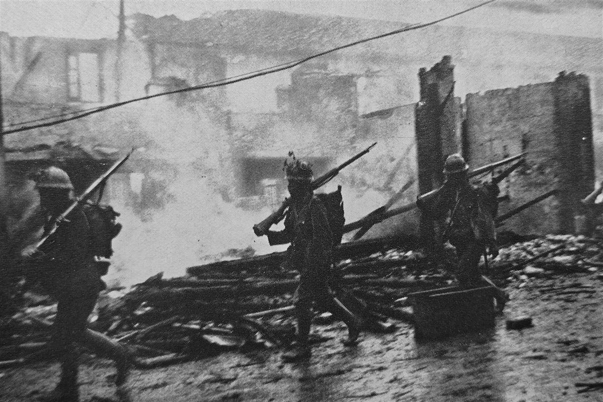 1938年10月26日,日军随军记者拍摄的侵华日军从宾阳门(现大东门)突入武昌城内。【图片由湖北日报全媒记者何宇欣扫描自日本于昭和十三年(1938年)十一月二十日印刷的世界画报】