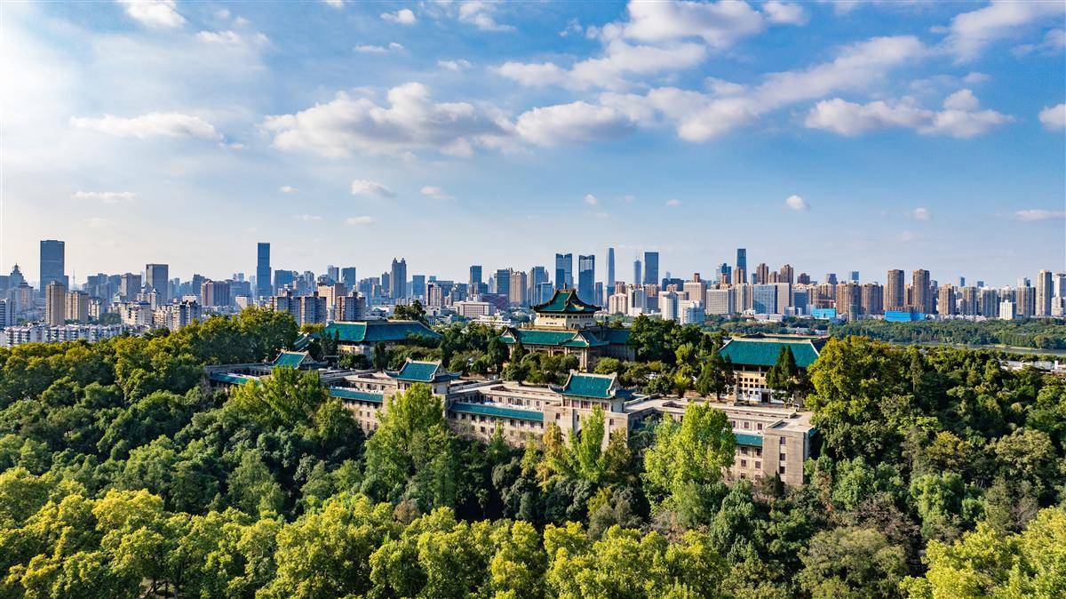 2025年10月22日,武汉大学早期建筑群被绿树环绕,背后是武汉的“城市天际线”(湖北日报全媒记者 何宇欣 摄)
