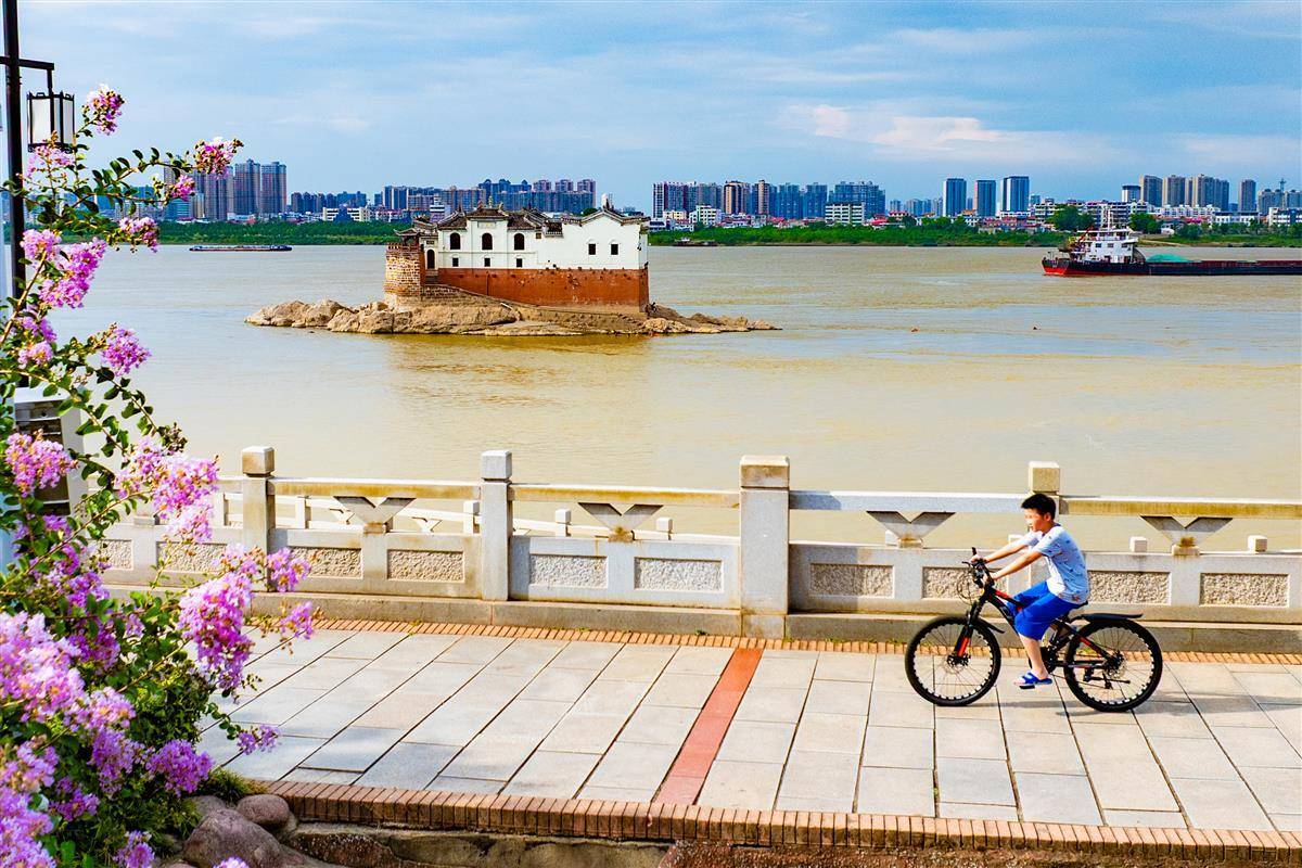 2025年8月1日,湖北鄂州,孩子骑着自行车经过花开正盛的长江江滩,背后的观音阁依旧巍然屹立,远处的黄冈市区大片高楼拔地而起,江面上航行的是川流不息的货轮,一副生机勃勃的景象印入眼帘。(湖北日报全媒记者 何宇欣 摄)