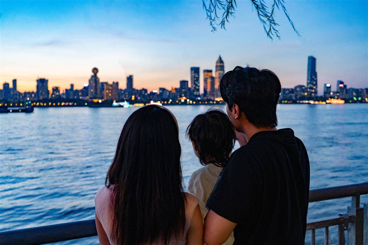2025年8月22日傍晚,武汉市民一家三口在武昌江滩公园远眺华灯初上的汉口城区。(湖北日报全媒记者 何宇欣 摄)