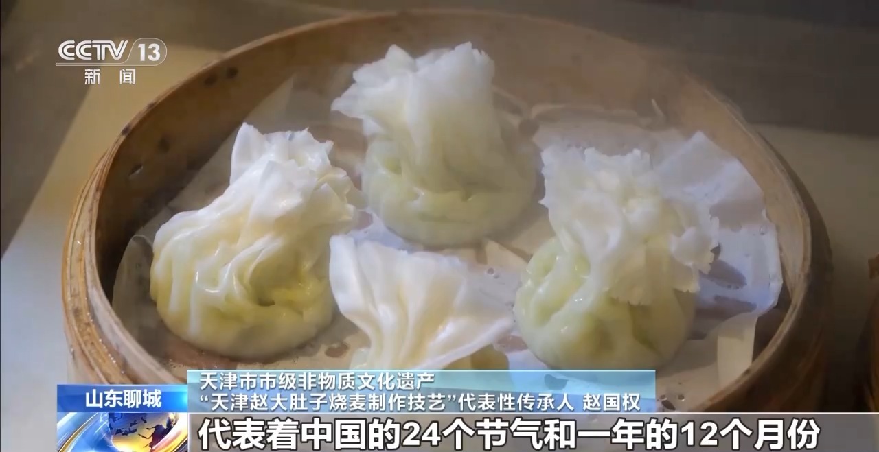 天津市市级非物质文化遗产“天津赵大肚子烧麦制作技艺”代表性传承人 赵国权:赵大肚子烧麦最大的特点是皮子特别薄,上面的花朵也是有数量的,是36朵。一边24朵一边12朵,代表着中国的24个节气和一年的12个月份。