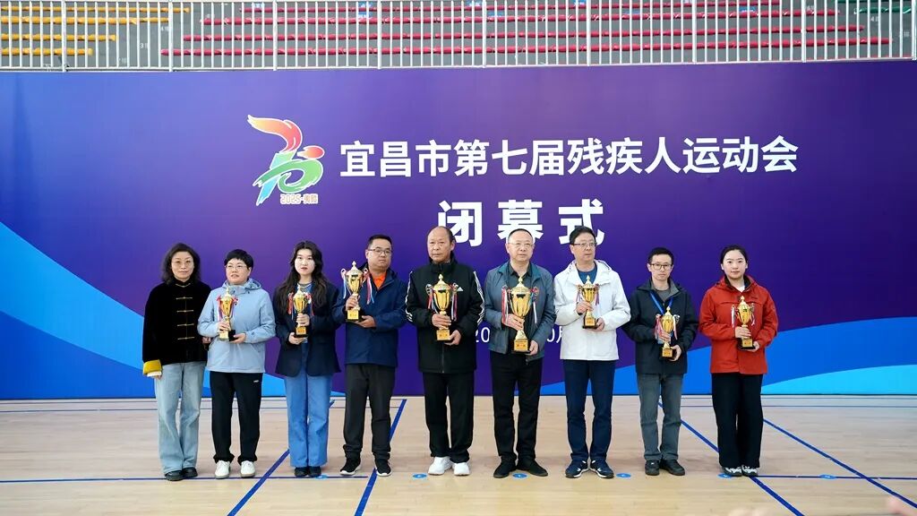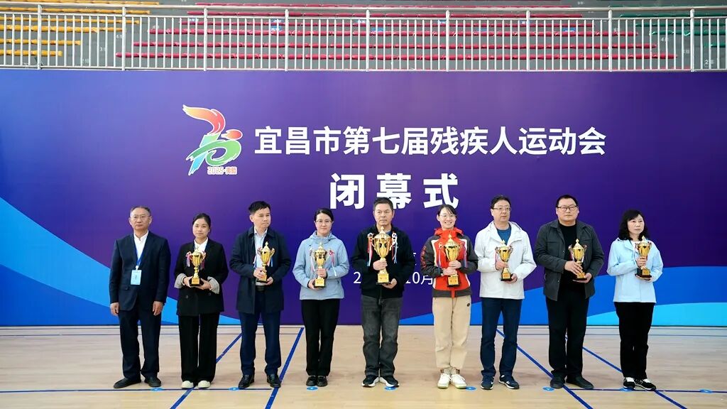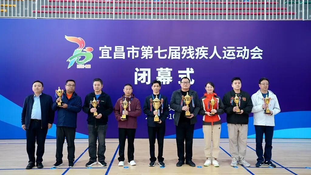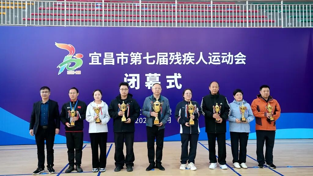闭幕式上,总裁判长宣布比赛成绩,长阳土家族自治县、当阳市、夷陵区、西陵区、兴山县、伍家岗区、秭归县、宜都市位列本届残运会(七项)团体总分前八名,当阳市代表团、夷陵区代表团、长阳土家族自治县代表团、秭归县代表团、远安县代表团获得体育道德风尚奖,夷陵区人民政府获得承办贡献奖。