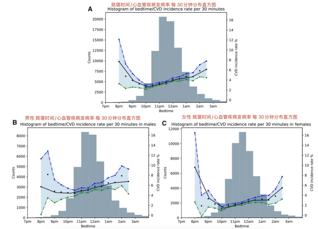 睡眠开始时间与心血管疾病发病率之间的关系,(A)总体样本(B)男性(C)女性。