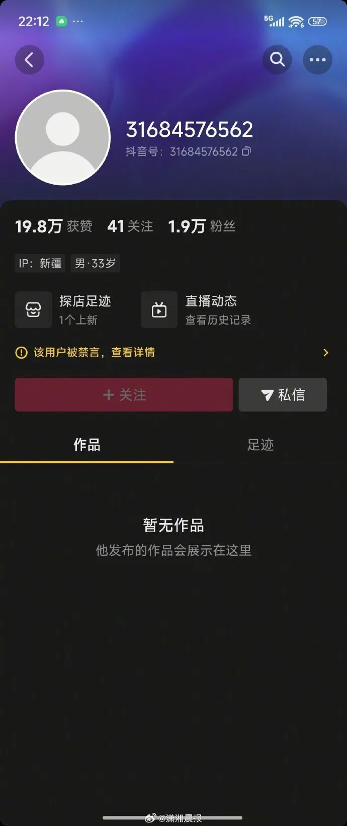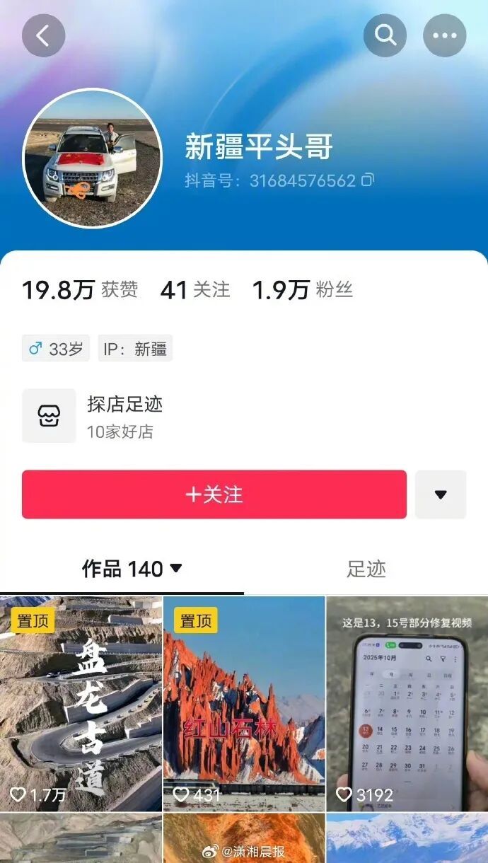 10月23日晚,记者检索发现,目前,“新疆平头哥”发布的视频均已不可见,昵称和头像已被初始化,该账号也无法被关注。