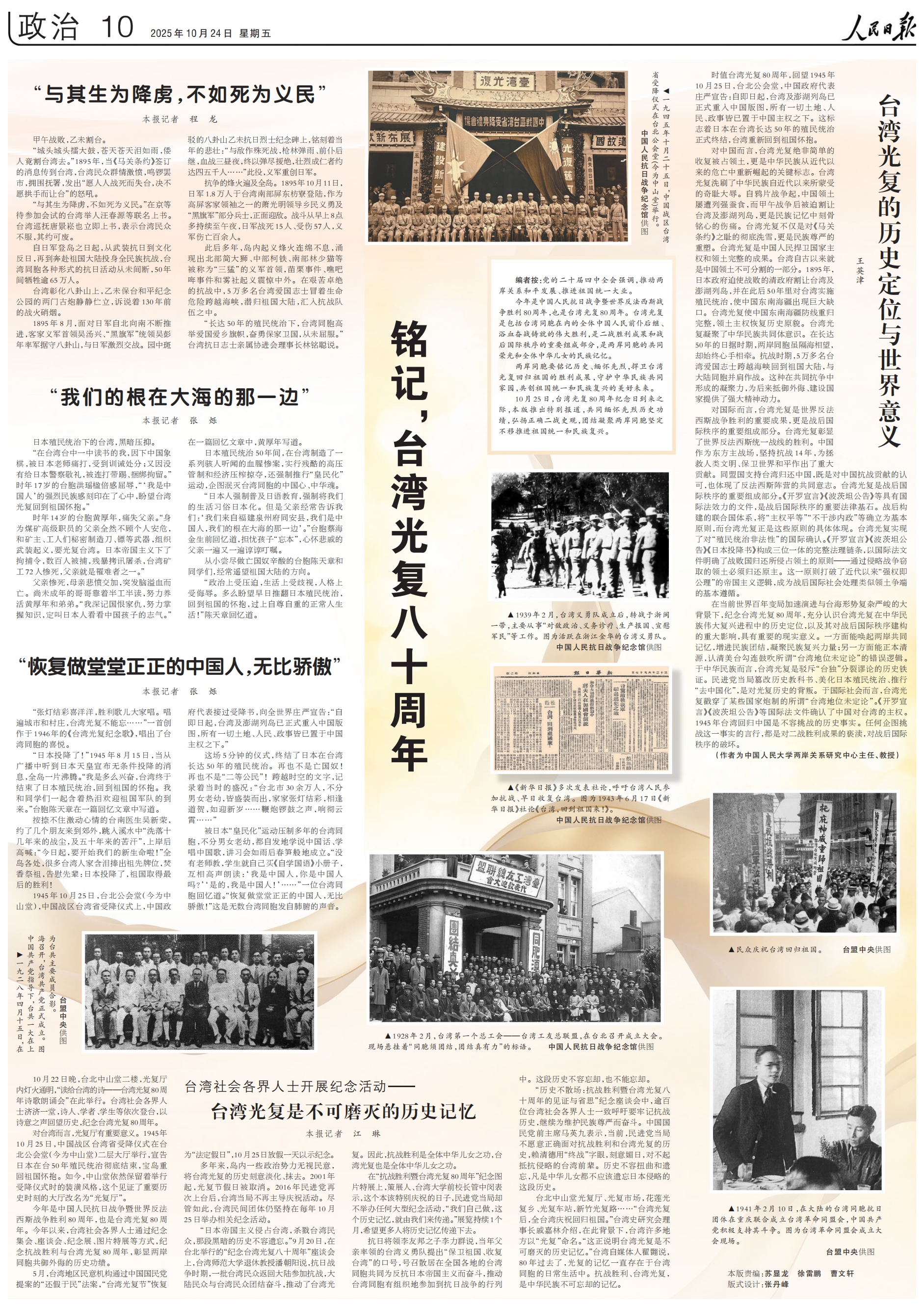 10月25日,台湾光复80周年纪念日到来之际,本版推出特别报道,共同缅怀先烈历史功绩,弘扬正确二战史观,团结凝聚两岸同胞坚定不移推进祖国统一和民族复兴。