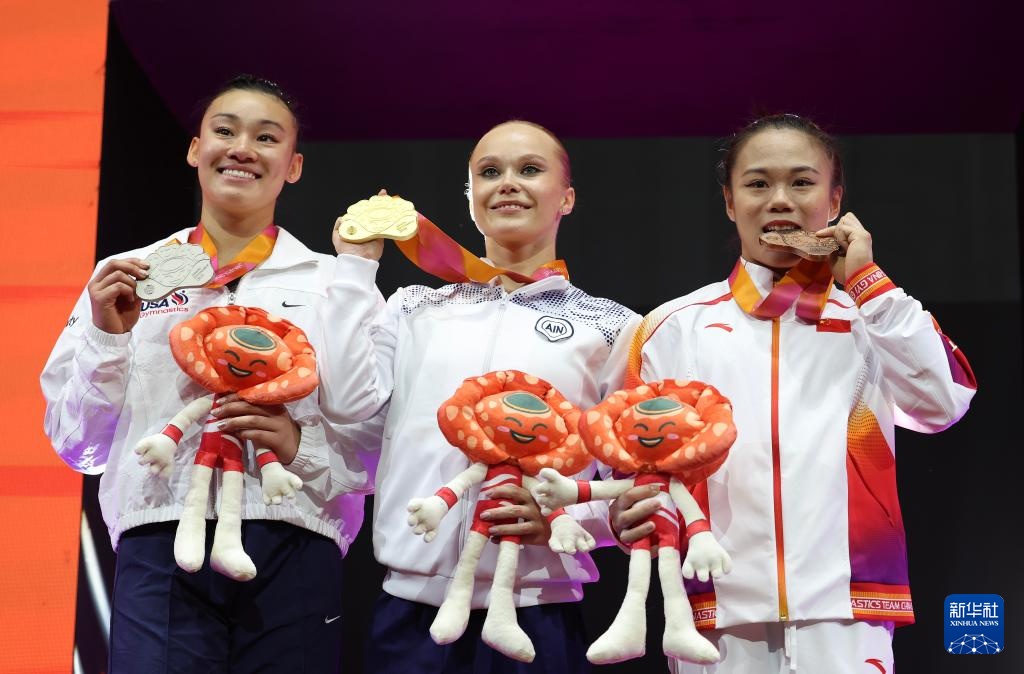 10月23日,冠军中立选手梅尔尼科娃(中)、亚军美国选手莉安·黄(左)和季军中国选手张清颖在女子个人全能颁奖仪式上。