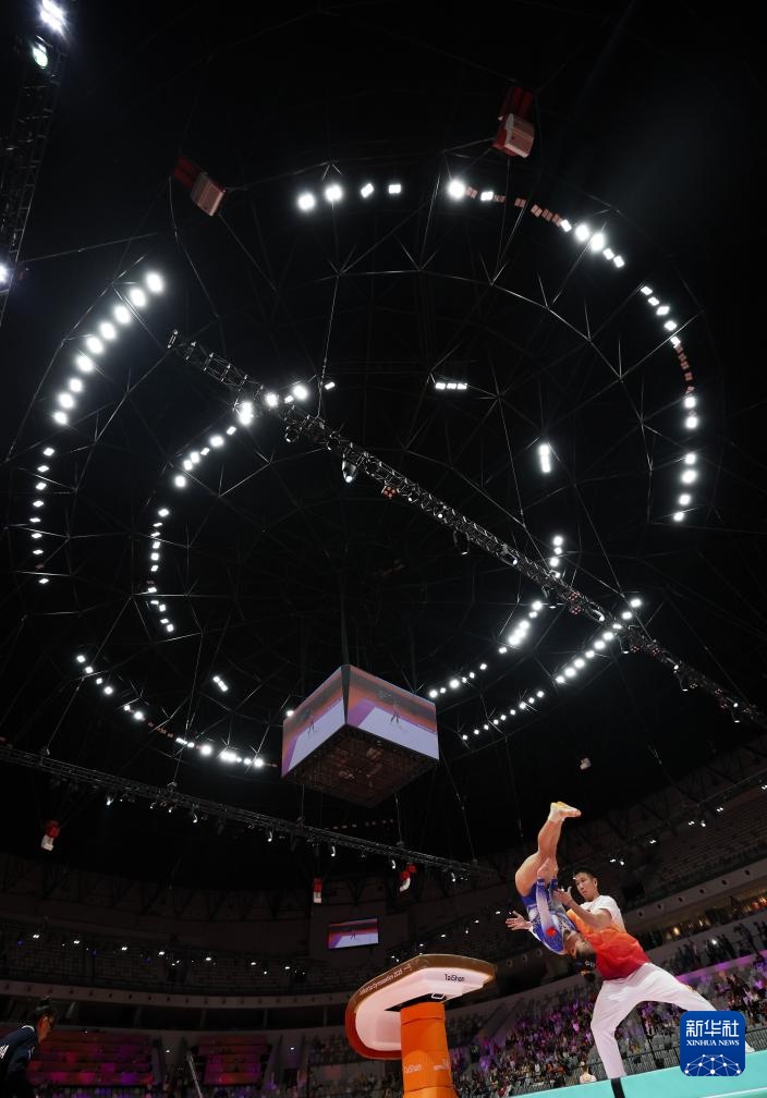 10月23日,张清颖(左)在女子个人全能决赛跳马项目赛前热身时接受教练保护。