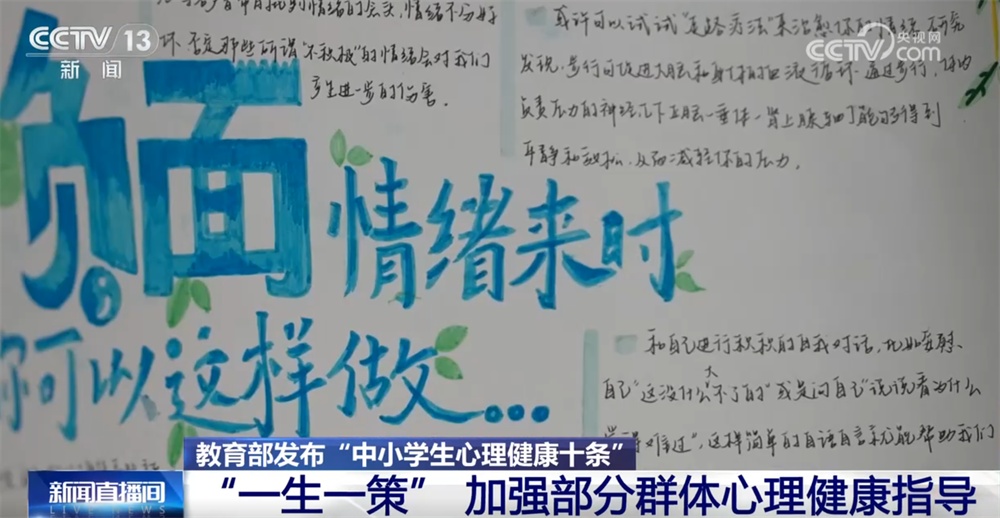央视网消息:教育部近日发布通知,提出进一步加强中小学生心理健康工作十条措施,全面提升中小学生心理素质,促进中小学生健康成长。