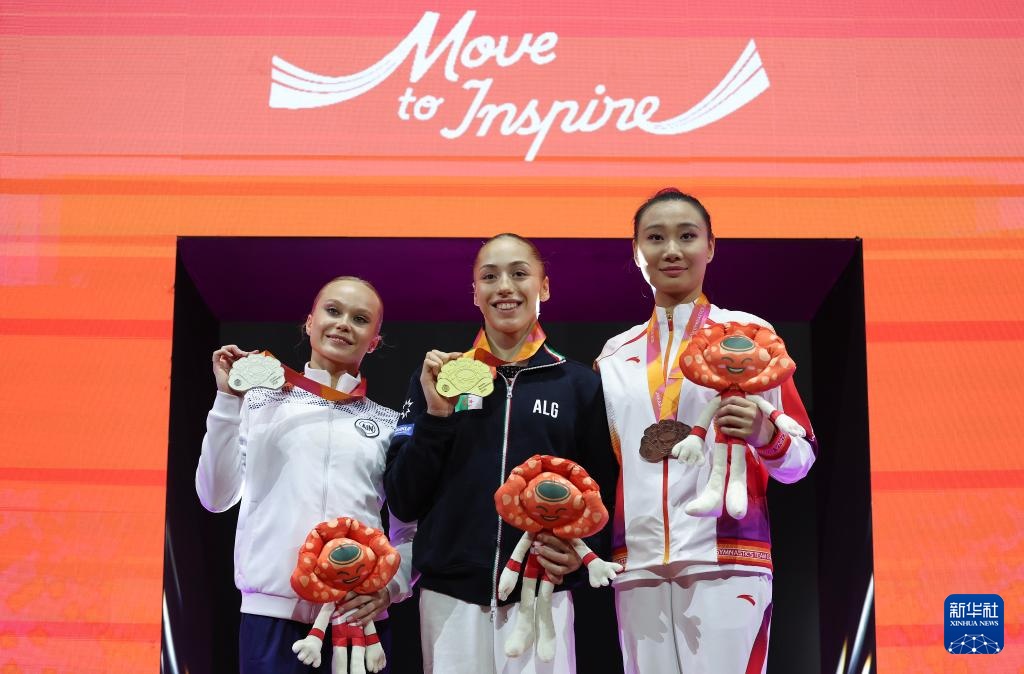 10月24日,冠军阿尔及利亚选手奈穆尔(中)、亚军中立选手梅尔尼科娃(左)和季军中国选手杨凡予微在颁奖仪式上。