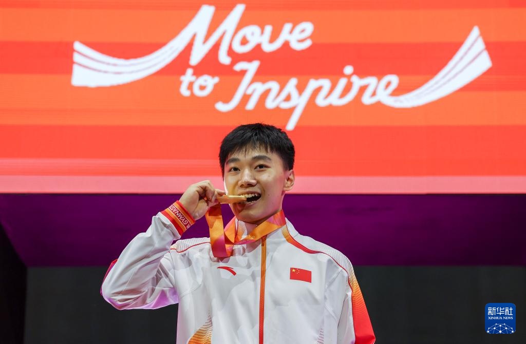10月24日,冠军洪延明在颁奖仪式上咬金牌庆祝。