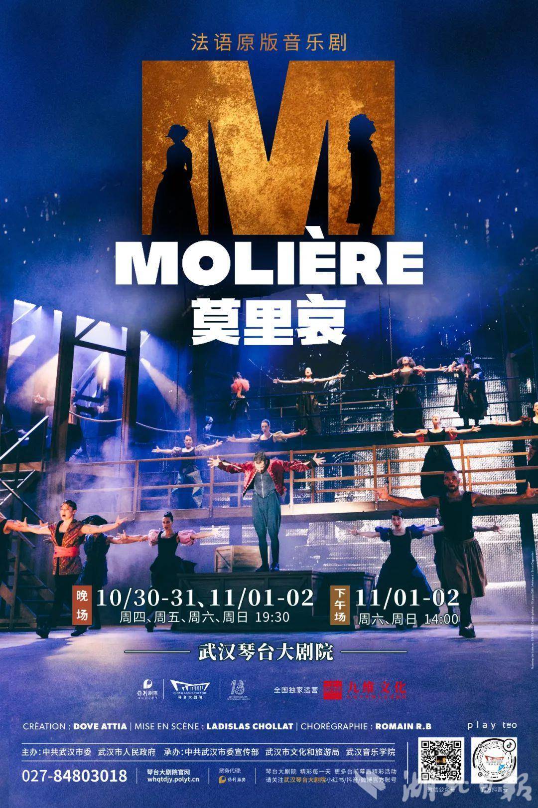 湖北日报讯(记者农新瑜、通讯员周媛媛)用喜剧揭露沉疴,用生命祭献舞台。从武汉琴台大剧院获悉,第十四届琴台音乐节“国际精品单元”的重磅演出——法语原版音乐剧《莫里哀》(Molière - Le Musical)将于10月30日至11月2日首次登陆中国,在武汉琴台大剧院连演6场。