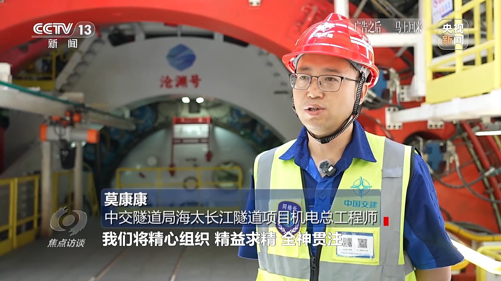 中交隧道局海太长江隧道项目机电总工程师 莫康康:为了保证施工的安全,“江海号”已经率先始发,“沧渊号”紧随其后。接下来的三年,面对超长距离的掘进施工任务,我们将精心组织,精益求精,全神贯注,保证海太隧道施工的贯通。
