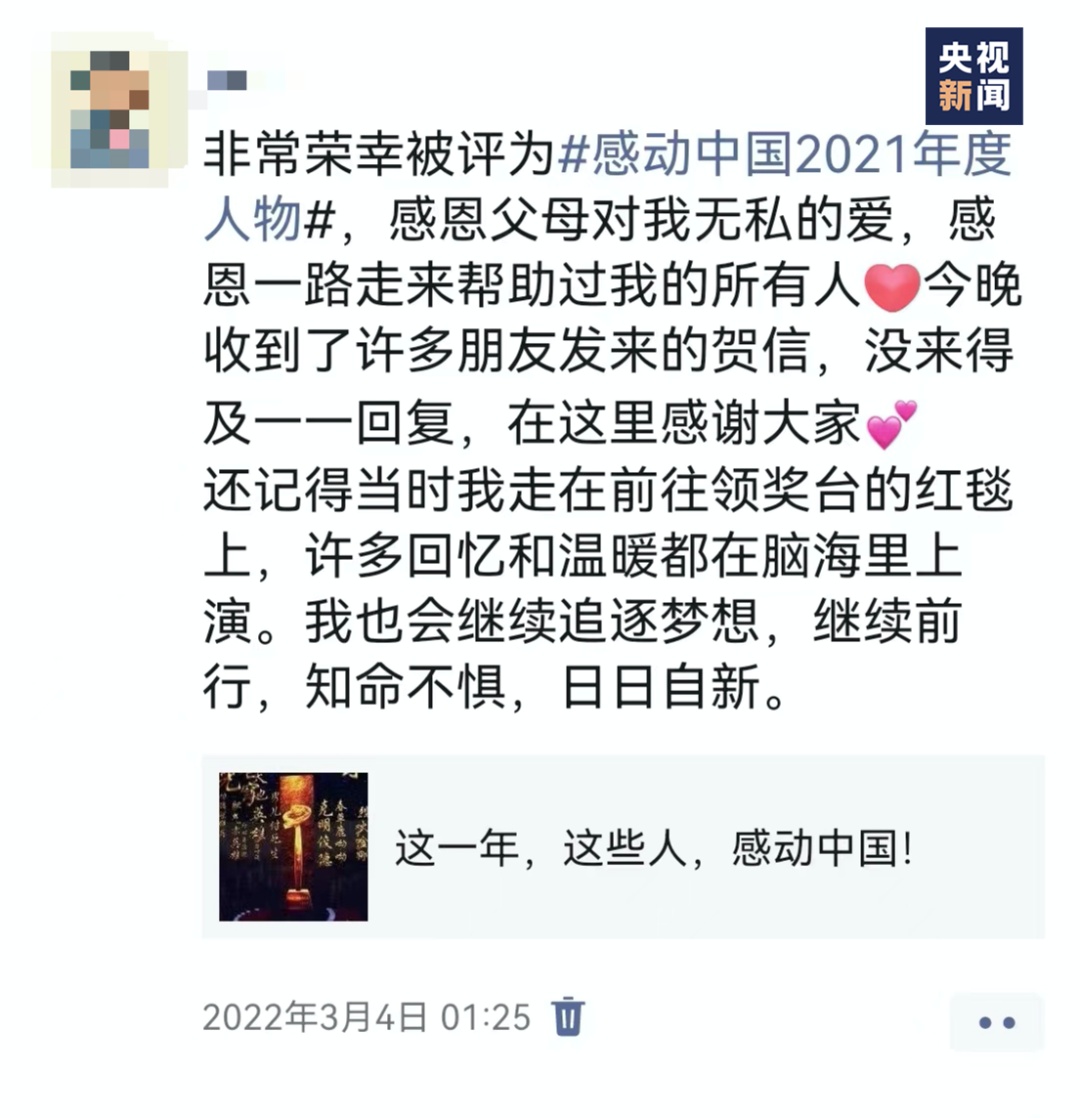 读博期间,江梦南被评为“感动中国2021年度人物”。