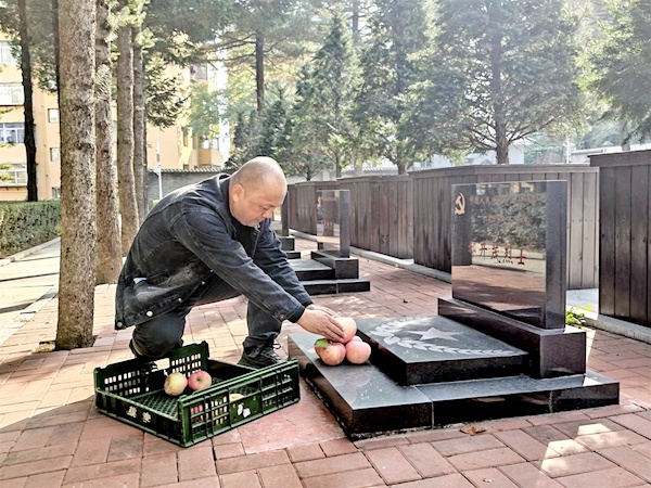 支先生在烈士墓前摆放苹果
