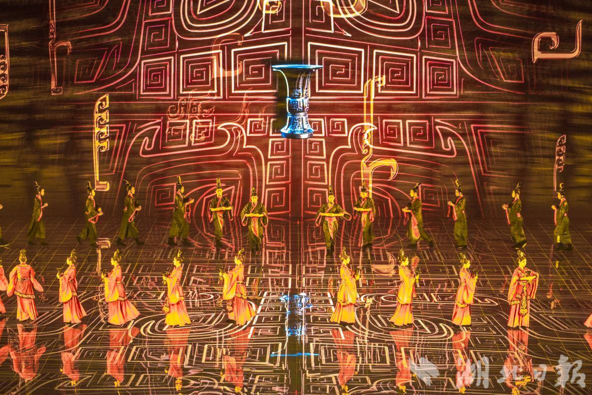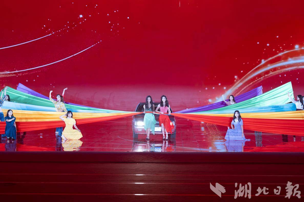 舞台大屏上,武汉最早的原住民——“汉阳人”九凤从远古走来、翩翩起舞,国宝级文物商代青铜器“天兽御尊”与“轩辕造车”的车轮交替呈现,三国甲士大军山下挥戈征战……文艺演出的序幕《江汉长歌》,追溯中国车谷历史文化之源。