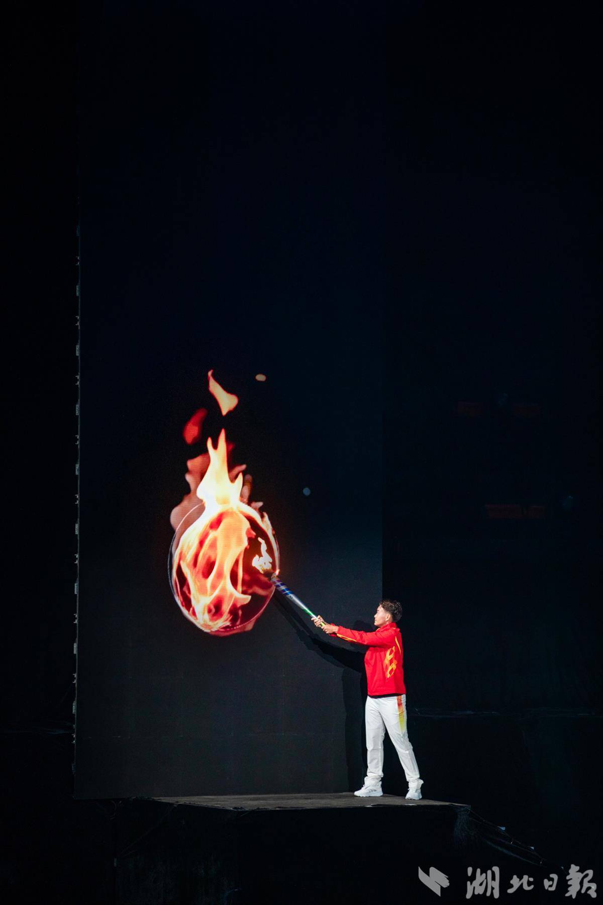 10月25日20时06分,中国女足运动员、武汉车谷江大女足队员王霜,将手中的火炬点在电子屏幕上,屏幕上“燃”起火球,江豚飞跃、把火球顶至星空,形成一团巨大的火焰……虚实之间,武汉市第十二届运动会主火炬点燃了!