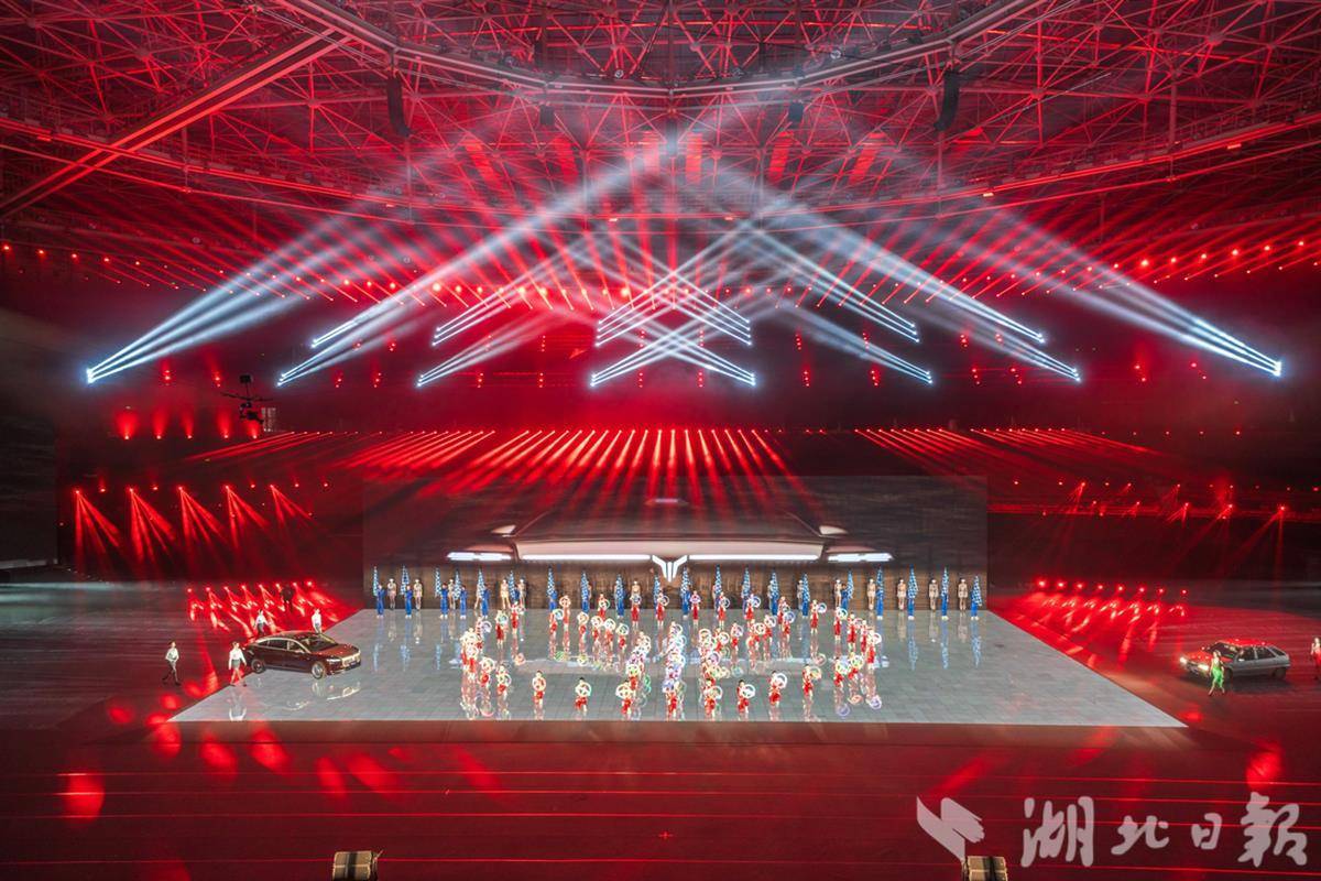 浩浩江水渐进、叠变为滚滚车流。圆了武汉人“轿车梦”的富康轿车、武汉汽车产业转型升级的代表作岚图追光L驶上舞台,智能工厂内一辆辆新能源汽车接连下线,中国车谷蓬勃发展的汽车产业跃然眼前。两台岚图FREE+、岚图知音载着4名歌手驶上舞台,演职人员载歌载舞,会歌《车谷有约》响彻夜空。