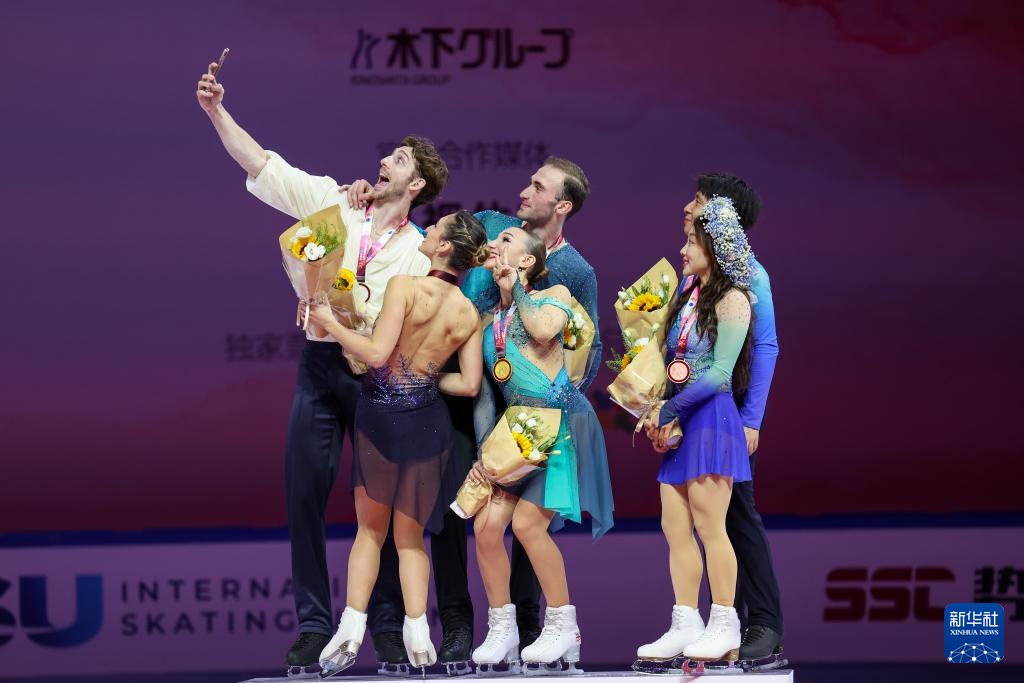 10月25日,冠军格鲁吉亚组合阿纳斯塔西娅·梅特尔基娜(前左二)/卢卡·别鲁拉瓦(后右)、亚军意大利组合萨拉·孔蒂(前左一)/尼科洛·马西(后左)和季军中国组合隋文静(右二)/韩聪在颁奖仪式上自拍合影。