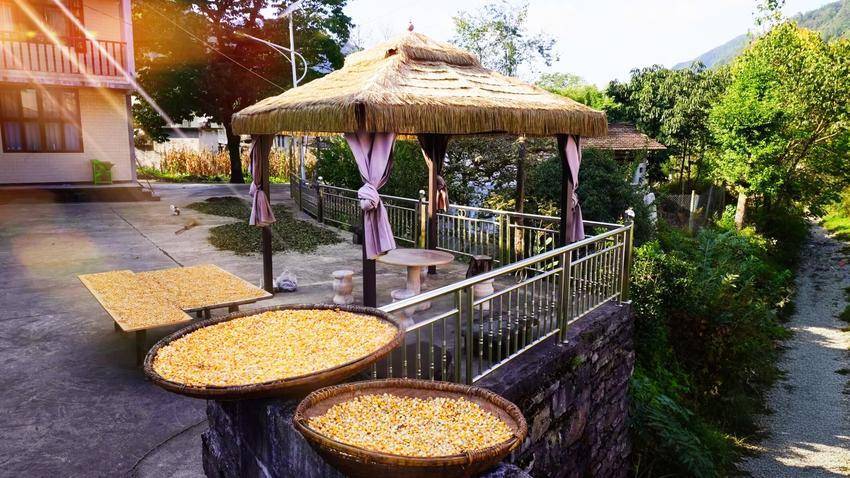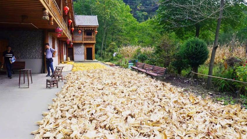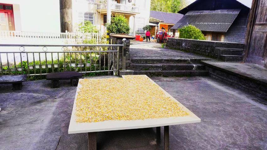 然而,真正让笔者惊艳的,是那独具特色的晒秋景象。由于高海拔气候的缘故,这里秋收的时间较晚。有的农户刚收完迟苞谷,撕下的阔叶满满当当地铺在小院里,在阳光下闪烁着生命的光泽;有的苞谷已脱粒成米,金黄的颗粒如繁星般洒落,将小院装点得一片灿烂。