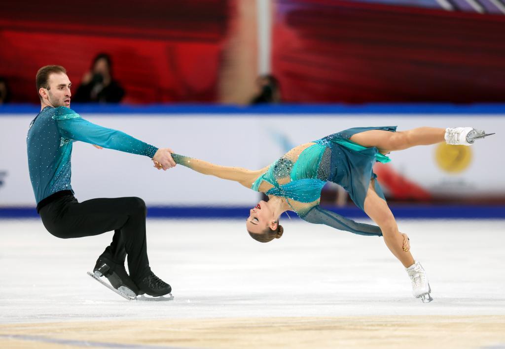10月25日,格鲁吉亚组合阿纳斯塔西娅·梅特尔基娜(左)/卢卡·别鲁拉瓦在自由滑比赛中。最终,他们夺得双人滑比赛冠军。